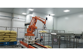 機(jī)器人在該項工作的應(yīng)用,極大的減少了工人勞動強(qiáng)度,增加了設(shè)備可靠性、穩(wěn)定性。通過更換不同的夾具,使其適用不同產(chǎn)品的卸垛/碼垛需求,增加了設(shè)備靈活性。